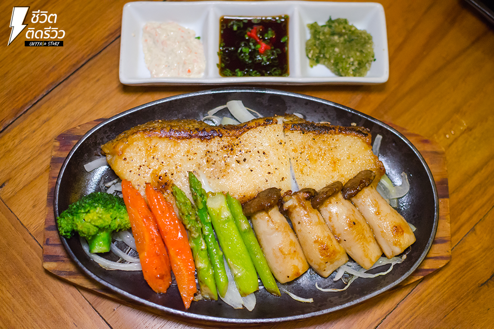 6. Snow Steak สเต๊กปลาหิมะ เมนูนี้เสิร์ฟมาแบบกระทะร้อนเลยค่ะ มีเครื่องเคียงอย่าง เห็ด แครอท น่อไม้ฝรั่ง และบร็อคโคลี่ย่าง และเพิ่มรสชาติด้วยซอส 3 แบบ 3 รสชาติให้ได้ลอง ไม่มันไม่อ้วนทานได้ทุกคนจริงๆ